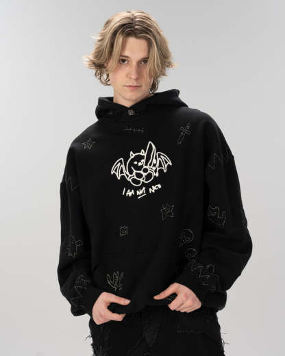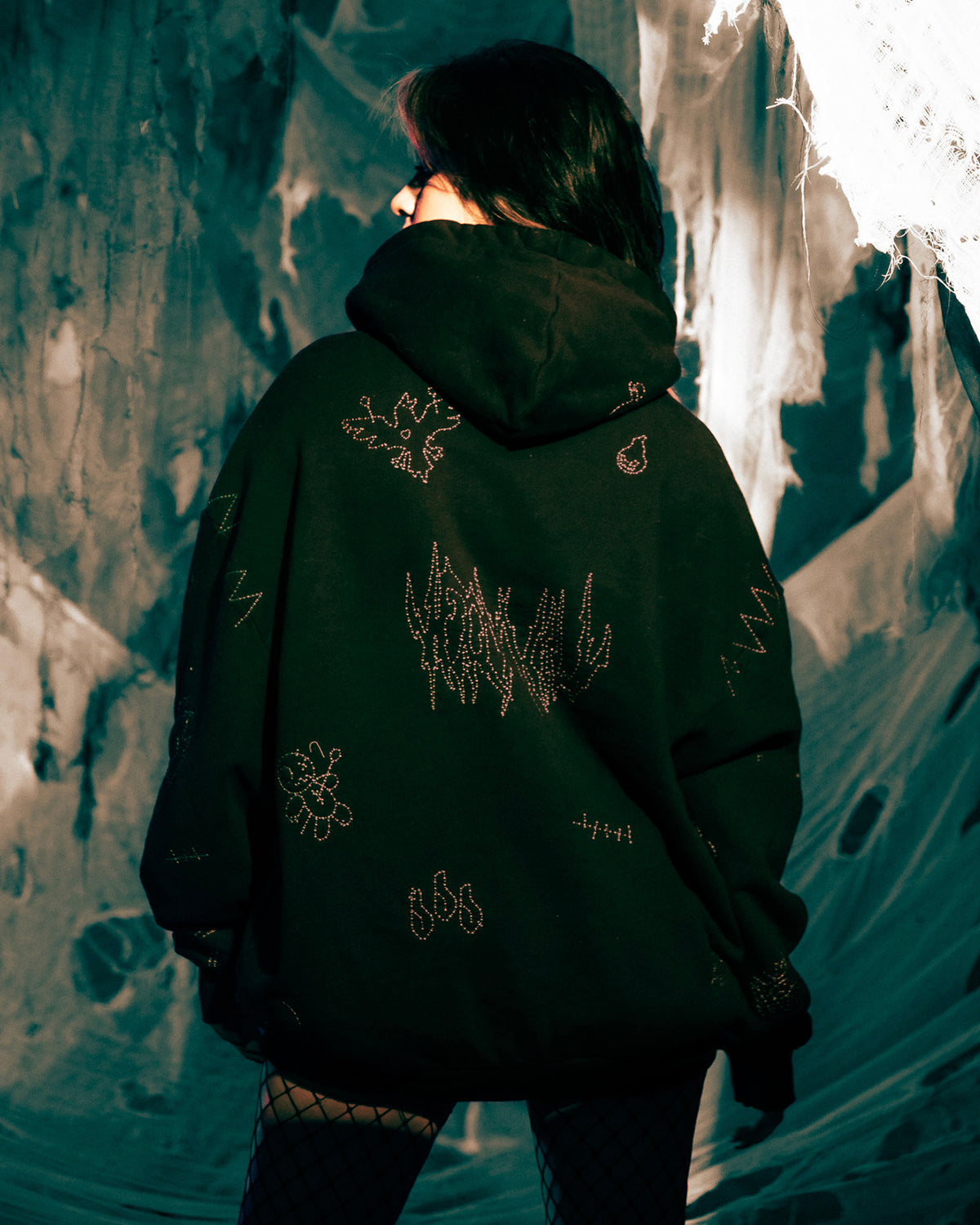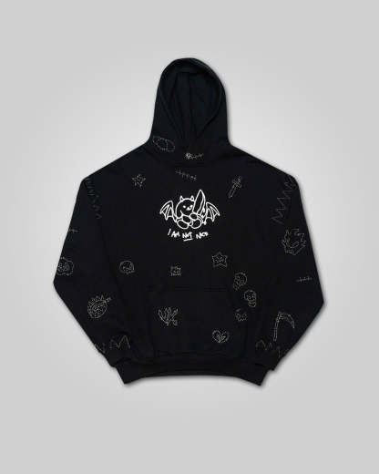 - Overlay hood with custom evil sun snap button closure