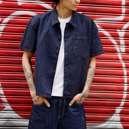 Introducing Our Short Sleeve Shirt in Blue With White Pinstripes. The shirt features one chest pocket with our signature logo embroidered into the upper left side. Cut to a refined boxy, slightly cropped fit making our short sleeve an outerwear essential.